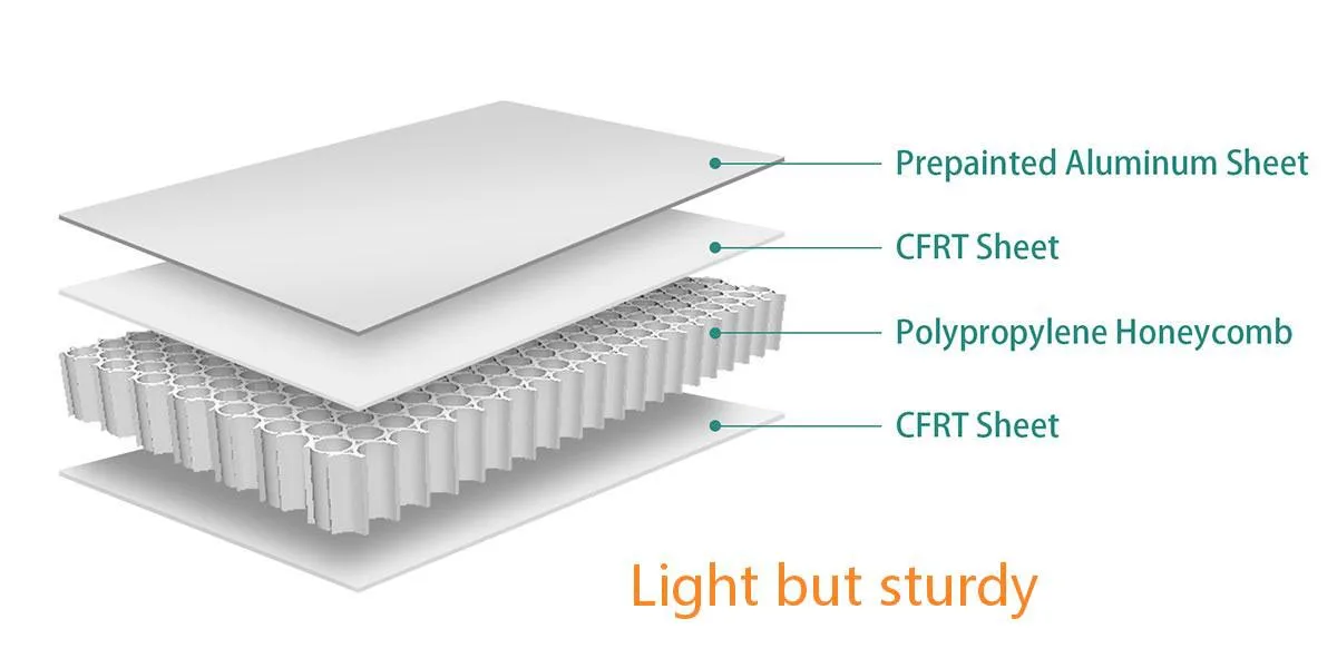 ●Сотовое решение: чрезвычайно легкий вес. Наши композитные панели обладают такой же или большей прочностью, чем сталь. при этом снижая массу тела на 30–50%.